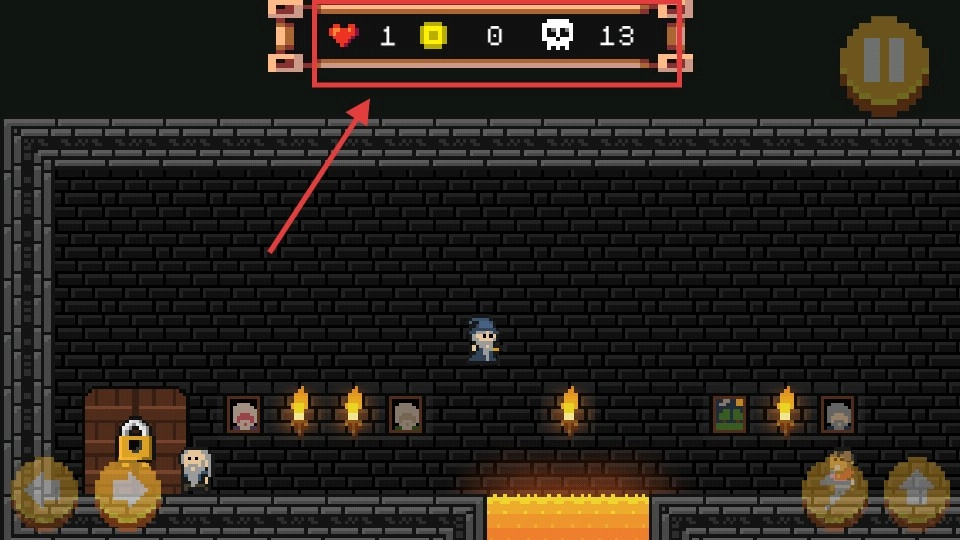 4、上方可看到血量(心)、金币(黄块)、死亡数(骷髅)。