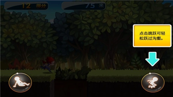 2、点击右下方的“跳跃”,就可以越过这个沟壑。