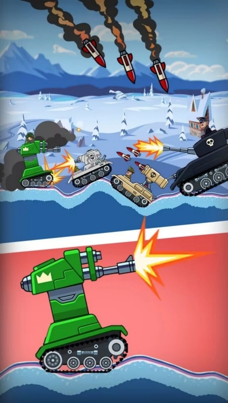 2、开放世界冒险关卡,操控坦克征服雪山、驰骋沙漠,机关解锁隐藏宝藏。