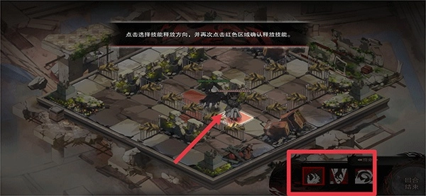 3、然后点击右下角的技能并点击选择技能释放的方向,接着再次点击红色区域释放技能