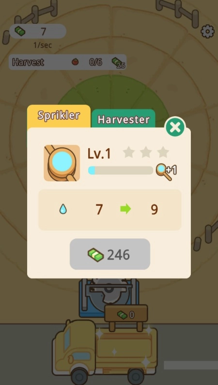 当你持续采摘成熟的作物时,既能获取金币,还能利用这些金币进行各类升级,像加快洒水速度、拓展耕作面积之类的。