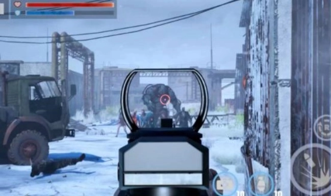 2、游戏采用第一人称视角,玩家控制的角色保持固定位置,僵尸会主动向玩家所在方向逼近;玩家可通过在屏幕左侧滑动手指来调整摄像头视角,点击或长按屏幕右侧即可进行射击操作;此外,屏幕左侧设有瞄准镜功能,右侧则配备了特殊物品栏。