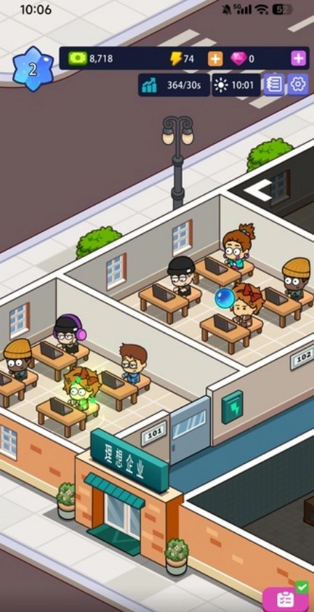 游戏采用轻松的放置玩法,玩家只需合理安排资源,放置各类办公设备和设施,就能获得租金收益。