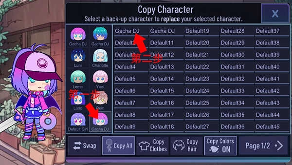 2、接下来进入人物备份界面,左侧显示当前已创建的角色列表,右侧是角色备份区域。若需复制某个角色,需先在左侧选中目标角色,随后点击右侧备份区域内的任意Default选项,即可将该角色备份至对应位置。