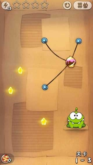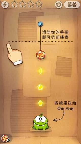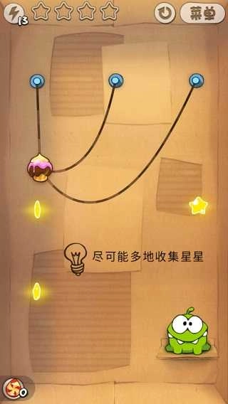 第三关延续了摆动的核心机制,关键在于精准把控角度。推荐先切断右侧的绳索,等糖果摆动到最高点并碰到上方星星的瞬间,立刻切断顶部的连接绳,这样就能顺势拿到第二颗星;之后的路线会自然推进,第三颗星也能轻松获取。