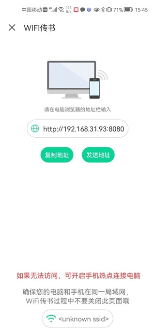 4、如果选择WiFi传书,需确保电脑与手机处于同一局域网,传书过程中请不要关闭当前页面;若无法正常访问,可尝试开启手机热点并连接电脑。