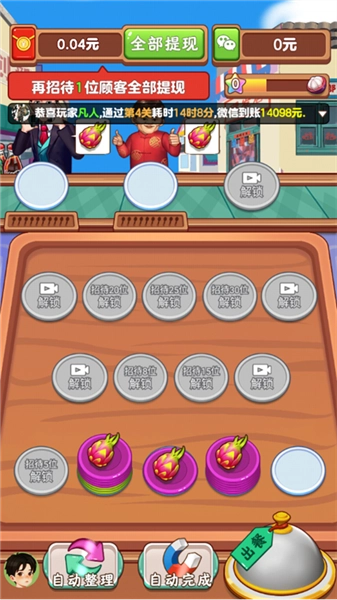 3、把菜品交付给外卖员,游戏流程就走完了。另外,通过对应的关卡后我们能解锁红包,达成相应目标就能提现。