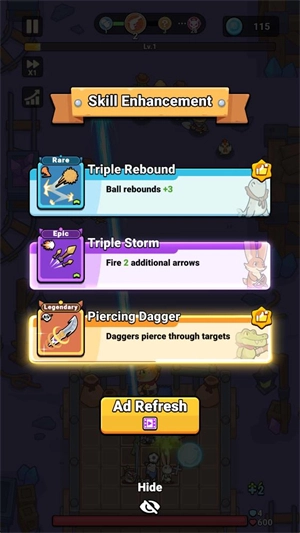 2、进入关卡后,玩家可将初始伙伴存入背包,相同伙伴能够合并以提升等级,点击“refresh”按钮即可获取新的伙伴。