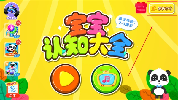 打开宝宝认知大全游戏,进入后点击右上角家长中心