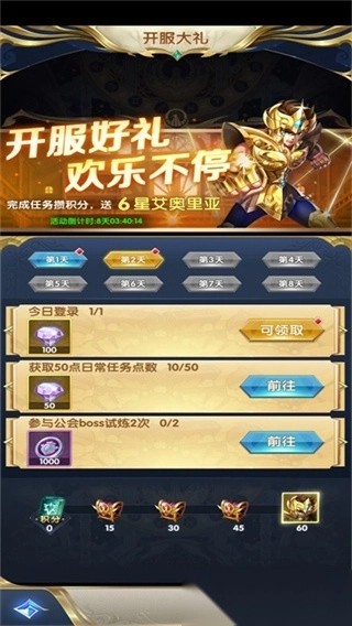 完成每日积分任务即可获得奖励,当完成任务积分达到要求即可获得强力6⭐英雄艾奥里亚,快快行动起来吧!