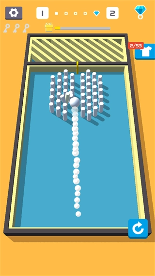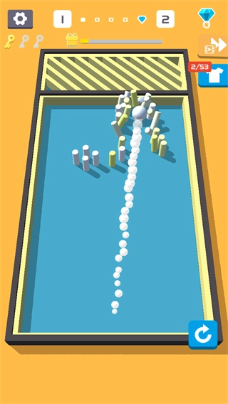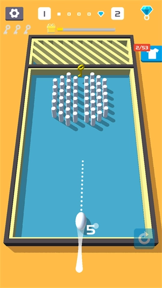 1、操控白色小球,调整发射角度,瞄准上方的柱子区域发射。