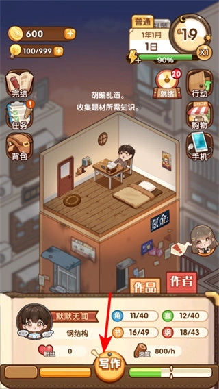 在游戏主界面,点击下方的写作按钮,即可收集题材所需的知识,以此推动小说创作进度——这是开启创作环节的关键操作,能让你进入创作流程。