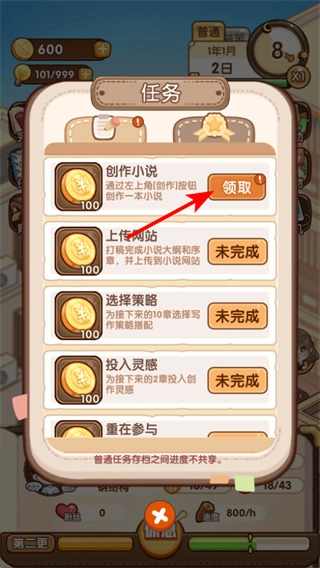 2、在任务界面完成小说创作任务后,点击领取按钮就能获得金币奖励,这些金币可用于提升创作能力资源等,为小说创作提供助力。