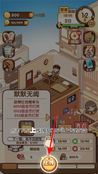 3、当小说创作进展到特定阶段时,点击上传按钮就能把小说上传至网站,以此增加作品的曝光量与影响力,助力游戏内的创作进程向前推进。
