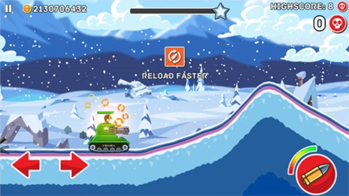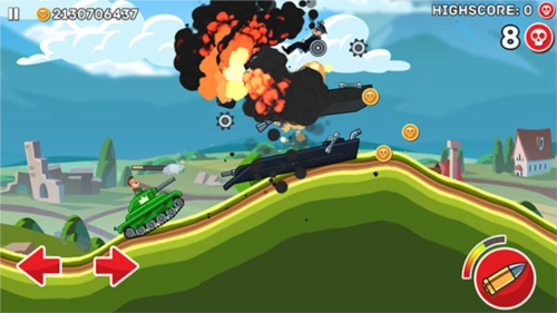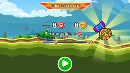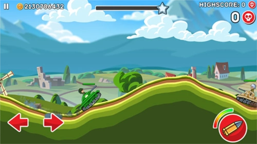 2、接着正式进入游戏环节,屏幕左下角的左右箭头按键分别对应战车的前进与后退操作,右侧的则是射击按钮;头顶显示的绿色血条代表己方战车的生命值,需要注意的是,要以尽可能小的损伤来赢得更多的胜利。