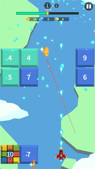 1、驾驶飞机如解锁的莱特A型在关卡中飞行,通过撞击数字方块来消除它们,同时收集金币。