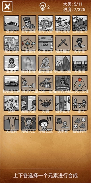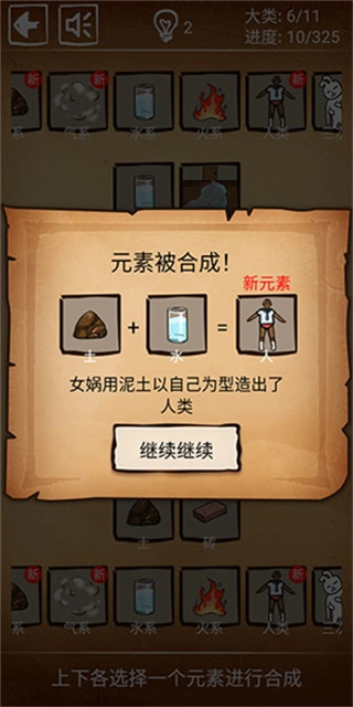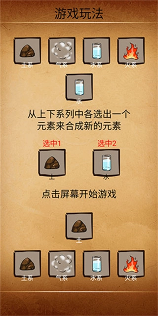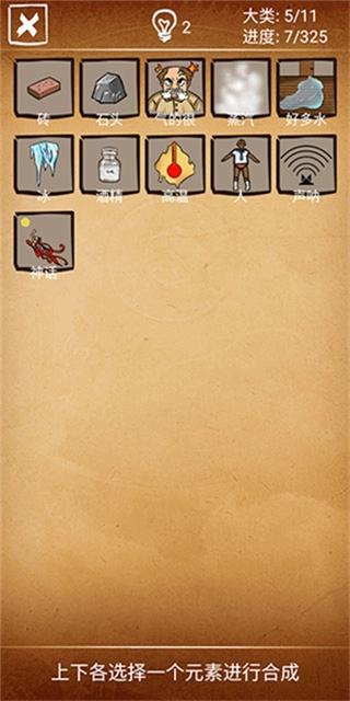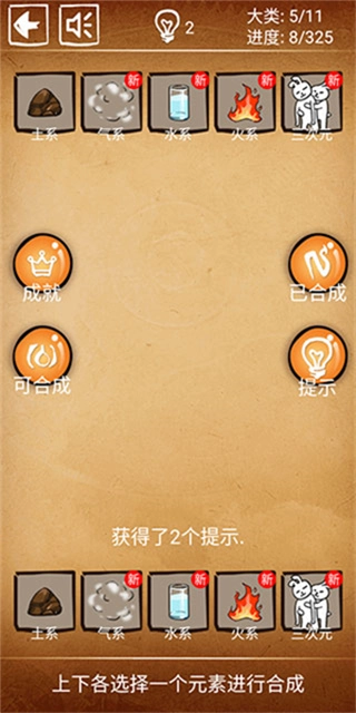 2、初始阶段仅有5个元素可供选择,需要通过合成操作来解锁更多元素。