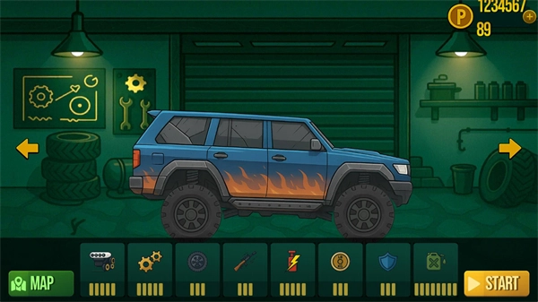 3、在正式开始前,玩家可对自己的车辆进行升级,可选择不同设施提升等级,升级完成后点击“start”即可开始。