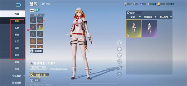 2、在仓库外观界面,可选择【套装】【头部】【面妆】等分类。
