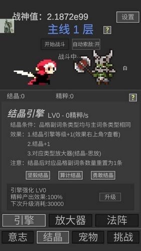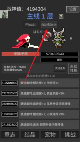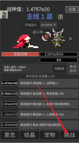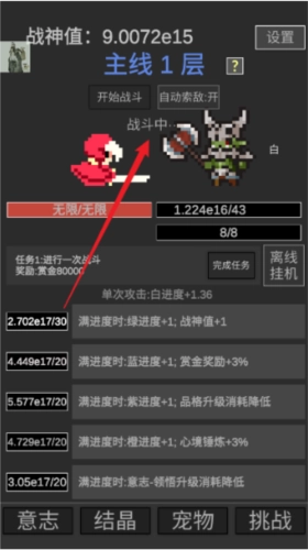 2、守护战神的尊严——当伤害足以秒杀敌人时,即可进入下一层。游戏内包含不少非常规设定,若有疑问,可在对应页面点击“?”号查看详细说明。