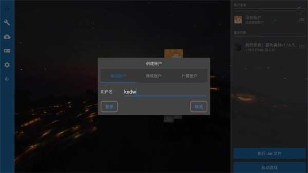 7、一切完毕后点击右下角开始游戏,第一次游玩的玩家需要先创建账号,这里选择离线就行,输入你的名称;