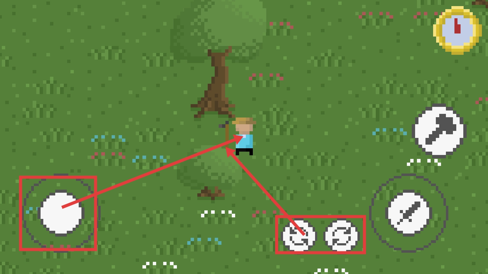 3、靠近资源点时,点击右侧【锤子】工具图标,让角色手持工具进行资源采集,积累农场发展物资。