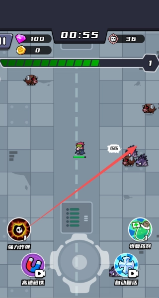 1、可以直接点击中间的按钮控制着角色进行移动,然后看到敌人它是会自动射击的。