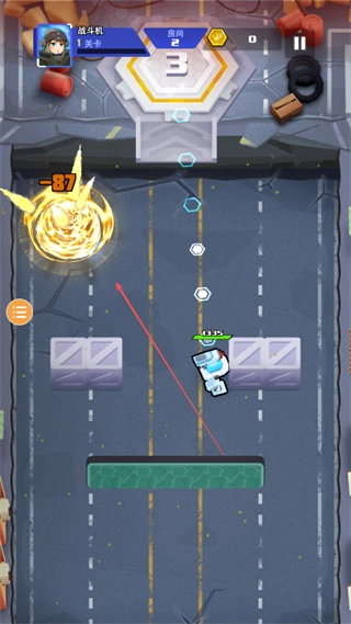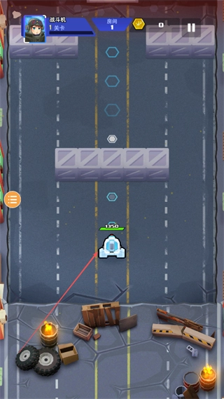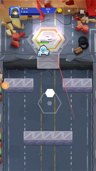 1、操控机甲在道路上移动,收集蓝色六边形道具,提升机甲等级。