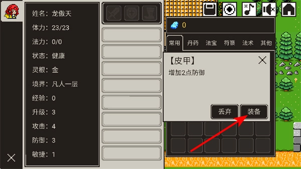 1、在道具界面点击如皮甲之类的装备,可查看其属性,这是了解装备增益的关键操作,查看后可选择是否装备以提升角色战力。