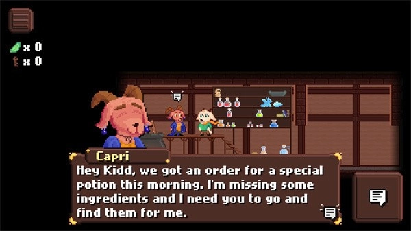《药剂师学徒》是一款休闲益智冒险类游戏,画面采用怀旧的像素风格。在游戏中,玩家将化身可爱又勤勉的小山羊“基德”,在药水店里协助工作。每当店内草药库存告急,年迈的师傅便会留守看店,同时派遣玩家前往山中采集新鲜草药。