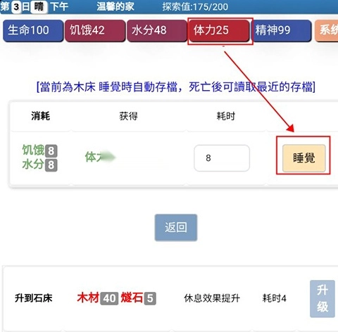 5、玩家可以通过睡觉来补充体力,使用木头可以制作床。