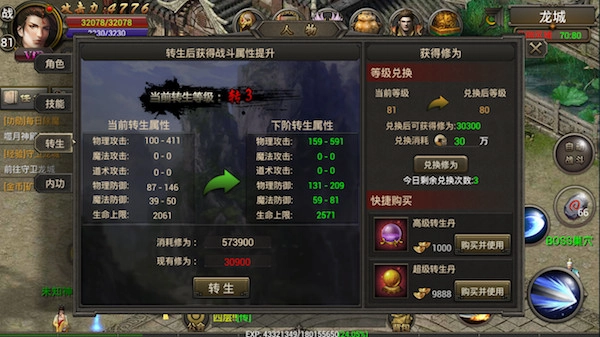 玩家达到80级开启转生,转生等级提高可以进入高等级地图、高级转生神殿,可以使用更强大的转生装备,所以在提升等级的同时也要提升转生等级哦。