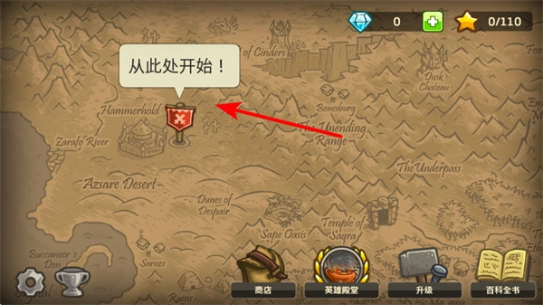 1、在地图界面点击带有红色旗帜的从此处开始区域,可进入防御关卡,这是游戏开始的关键操作,才能开启塔防战斗。