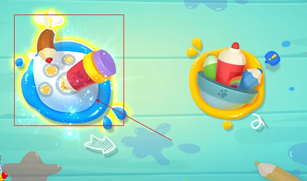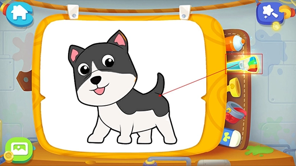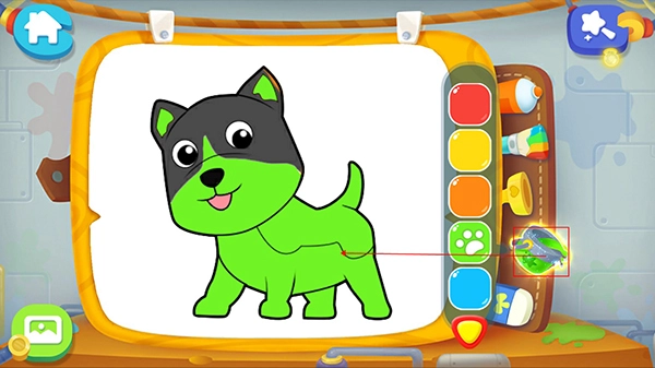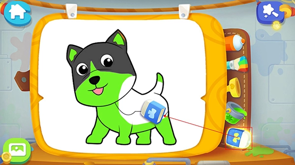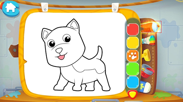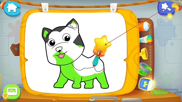 要是宝宝想快点完成画画,可以点击第二支彩色画笔,这样就能给图案快速上色了,不过这是系统自带的颜色哦,如果宝宝不喜欢,那就得自己动手上色啦!