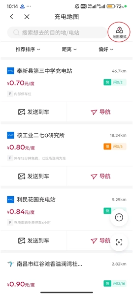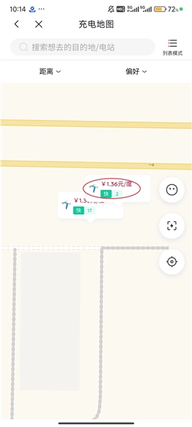 3、能看到附近的充电站,不过显示得不够清晰,你可以点击屏幕右上角的“地图模式”按钮。