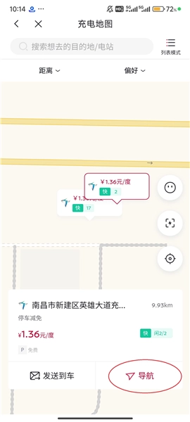 5、点击充电站后,点击右下角的“导航”按钮或者左下角的“发送到车”按钮即可。