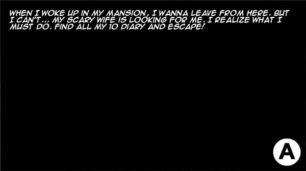 2、剧情大意:“当我醒来在我的豪宅,我想离开这里。但我不能…我吓人的妻子在找我,我意识到我必须做什么。找到我所有的10本日记并逃跑!”点击A继续。