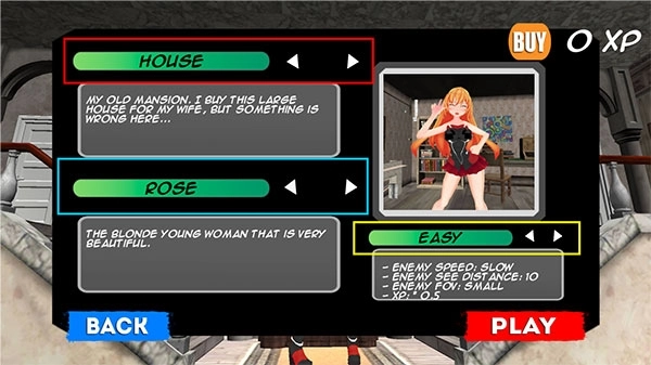 1、进入惊险刺激的妻子游戏,就像下面这张图展示的那样,红框里的“house”按钮能够切换场景地图,黄框中的“easy”按钮可以调整游戏难度,蓝框内的“rose”按钮则能切换不同形象的妻子角色。等把这些都设置好之后,点击“PLAY”按钮就能开始游戏啦。
