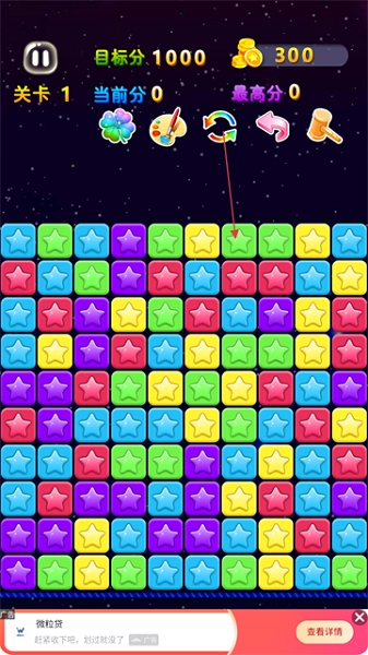 进入游戏关卡后,通过滑动星星方块,让2个及以上相同颜色的星星连成一线来消除它们,以此获得分数。