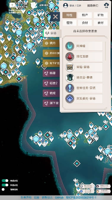 3、提供了涵盖风神瞳、岩神瞳、宝箱、野外BOSS、七天神像、NPC、传送点、地灵龛、矿藏、秘境等资源点的详细分布位置。