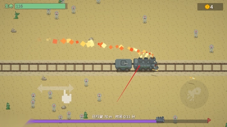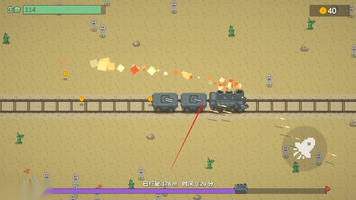 我们击败怪物仅能获得金币,无法获取经验值。界面下方设有进度条,唯有火车抵达终点时,方可进行属性选择——既可以提升护甲与血量,也能够增加额外的攻击车厢等。在持续前进的过程中,会途经商店,此时就能用击败怪物所得的金币购买物品,这些物品的效果和三选一的选择机制大致相同。敌人会从各个方向发起攻击,玩家必须阻止敌人接触车厢,不然就会因受到伤害而扣血。每个车厢都有独立的血量,即便车厢受损也没关系,最坏的情况不过是被击毁;但车头则不同,一旦车头损毁,整个游戏便会结束。