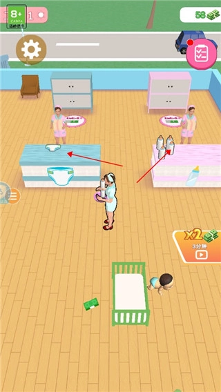 4、解决问题后,会有妈妈来接走孩子并留下钱,走到旁边就能拾取;拿到钱后移动到绿色图标处,系统会自动扣除金钱来解锁新的婴儿床。