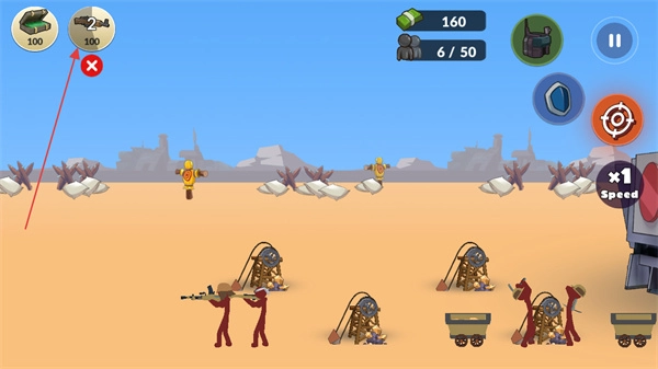 1、点击左上角兵种图标,派遣火柴人士兵出战,攻击敌方单位。