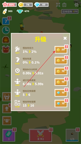 4、点击左侧的升级按钮进入属性界面,点击右侧按钮选择升级相应怪兽属性。