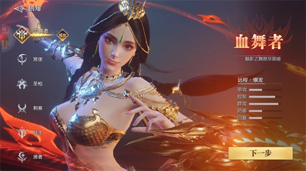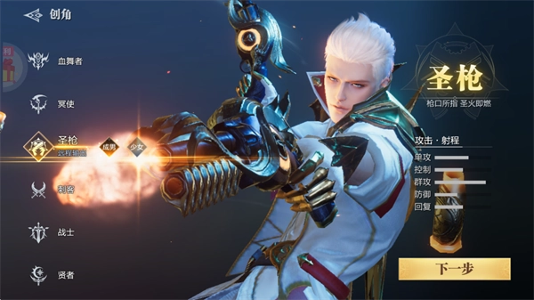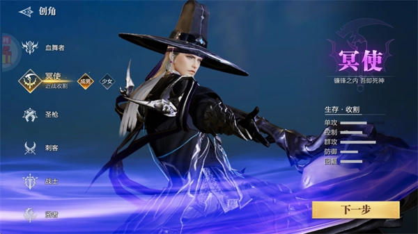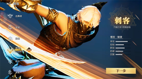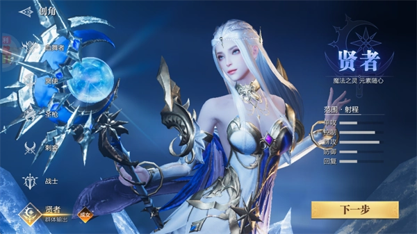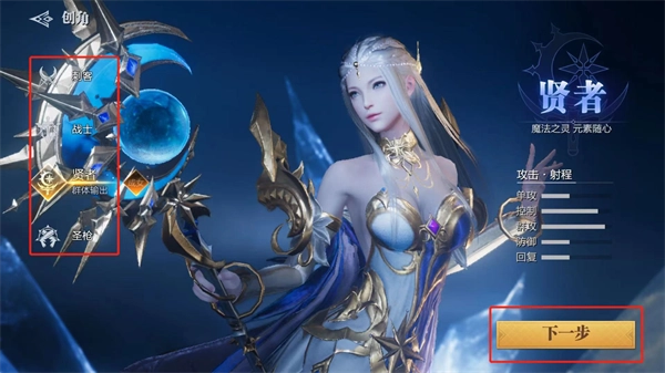 1、首先我们完成安装后打开游戏,第一步要创建一个角色,比如选择贤者这个职业;接着点击下一步按钮继续操作。