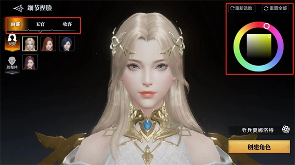 3、在细节捏脸界面,能够调整面部、五官以及妆容,要是对效果不满意,还可以点击右侧的按键重新进行设置。