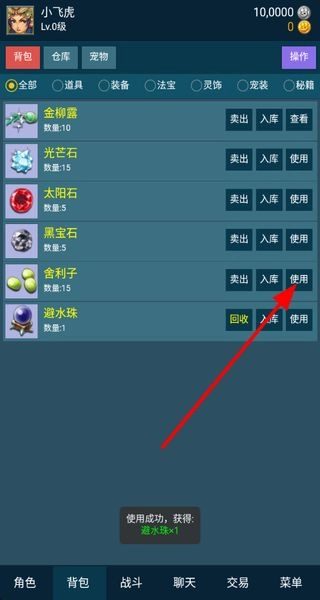 3、使用背包道具,在背包中选择舍利子等道具并使用,获取相应的物品或效果,提升角色的属性或解锁新功能。