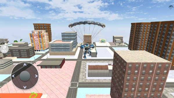 1、进入游戏后选择模式与关卡,通过高空跳伞抵达任务城市,熟悉机甲移动射击等基础操作。