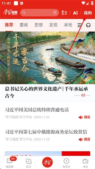 1、在学习强国首页点击右上角我的,进入我的页面。