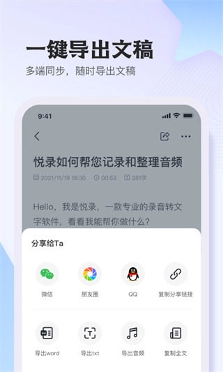 1、悦录支持多种音频格式和文稿格式,兼容各种设备和软件,用户可以随意选择使用。